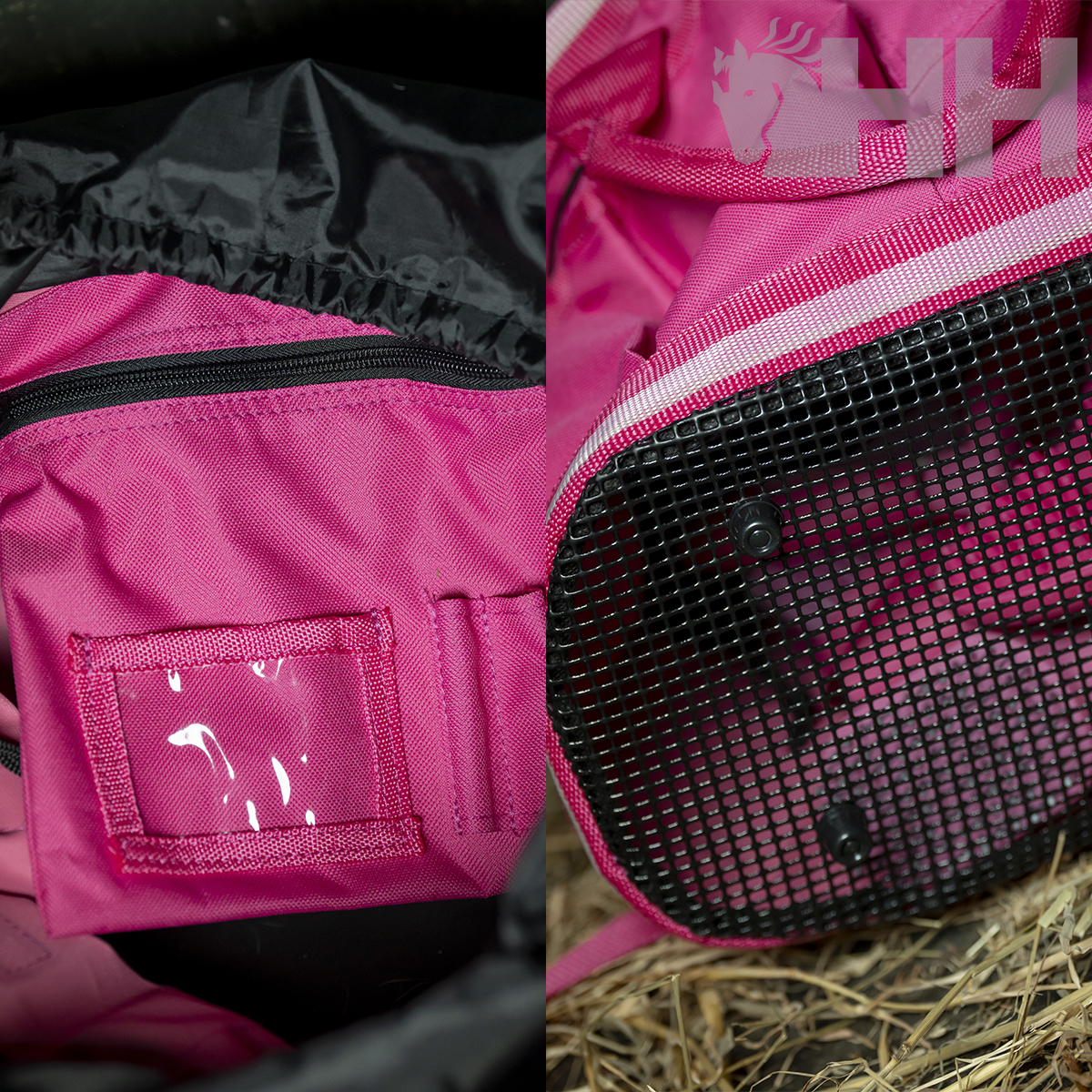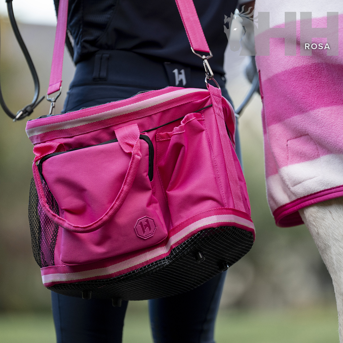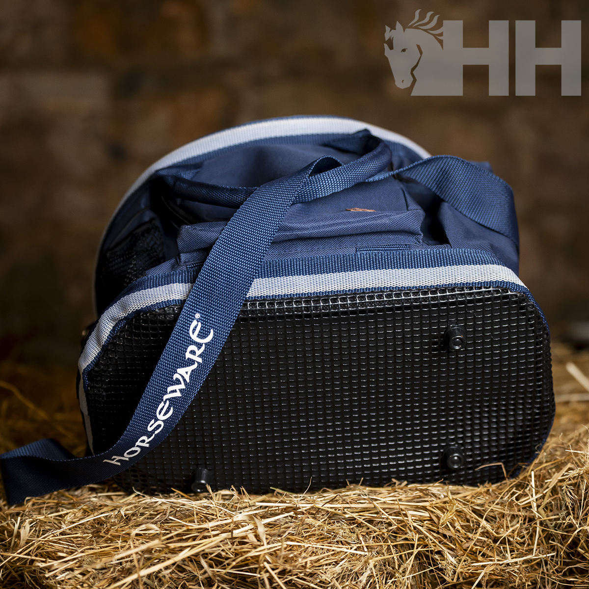 - Robust, durable polyester fabric grooming bag with drawstring top, mesh bottom and a removable