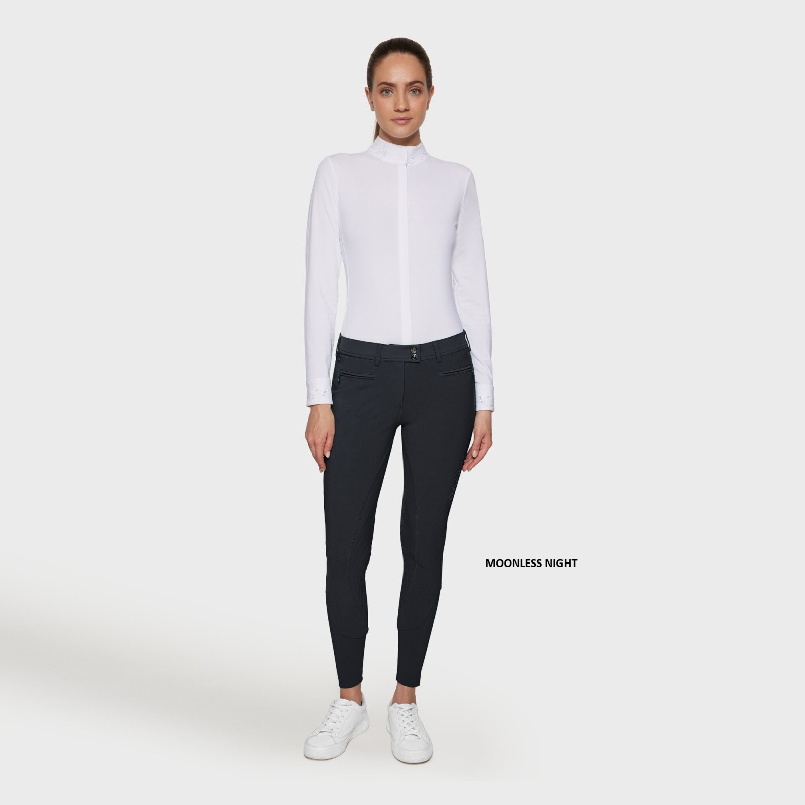 Os calções são decorados com um brasão Samshield feito com cristais Swarovski® e com Crystal Fabric Swarovski®, combinando feminilidade, tecnologia e requinte.