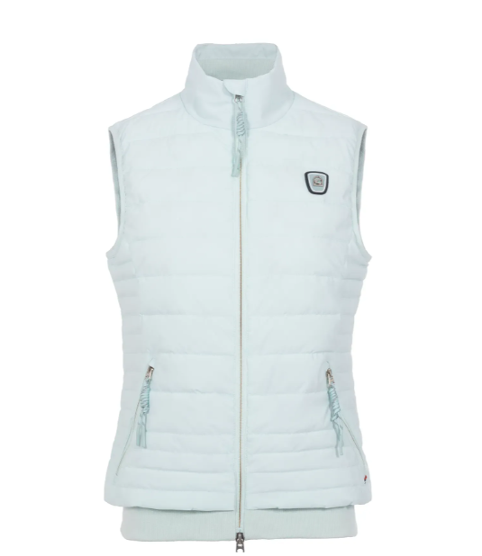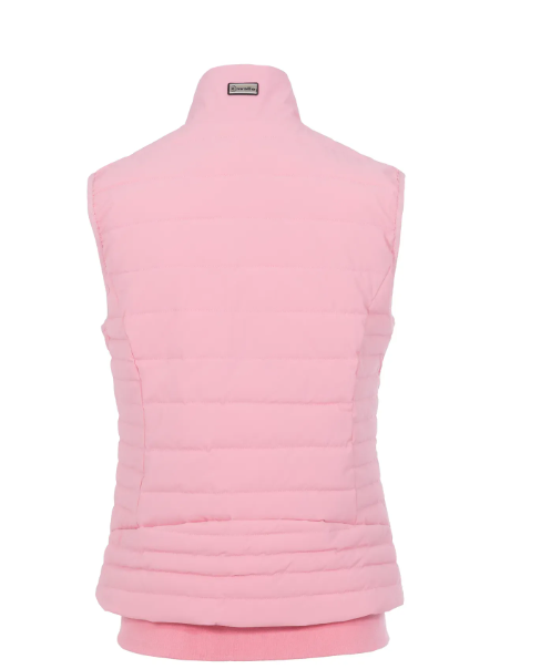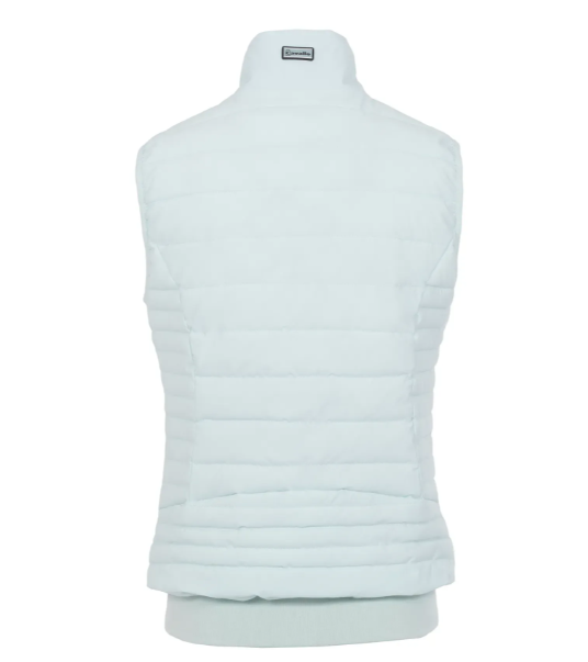 Colete curto e leve acolchoado com gola alta e enchimento falso de penas