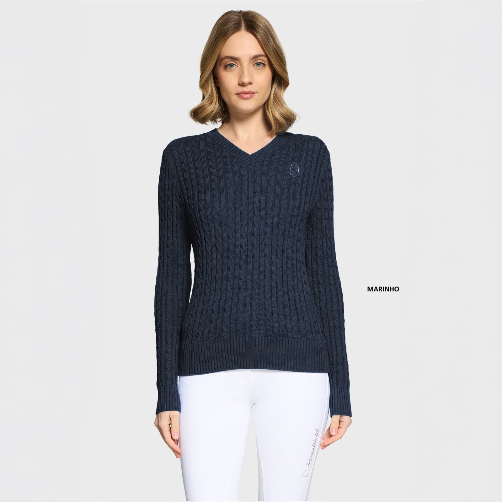 Punhos, gola e bainha canelados estruturam subtilmente a peça, enquanto o brasão de cristais Swarovski na frente exala elegância discreta. Pensada como um essencial premium, a Lisa Twisted acompanha o cavaleiro com sobriedade e autenticidade, dentro e fora do picadeiro.