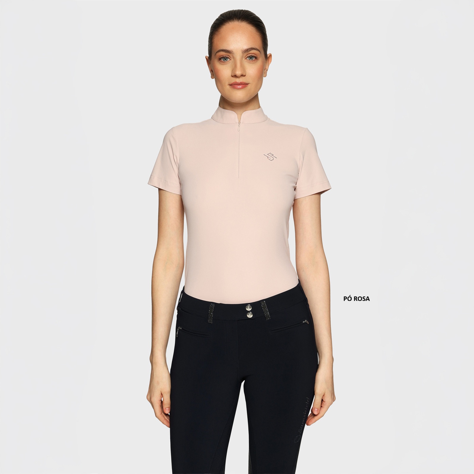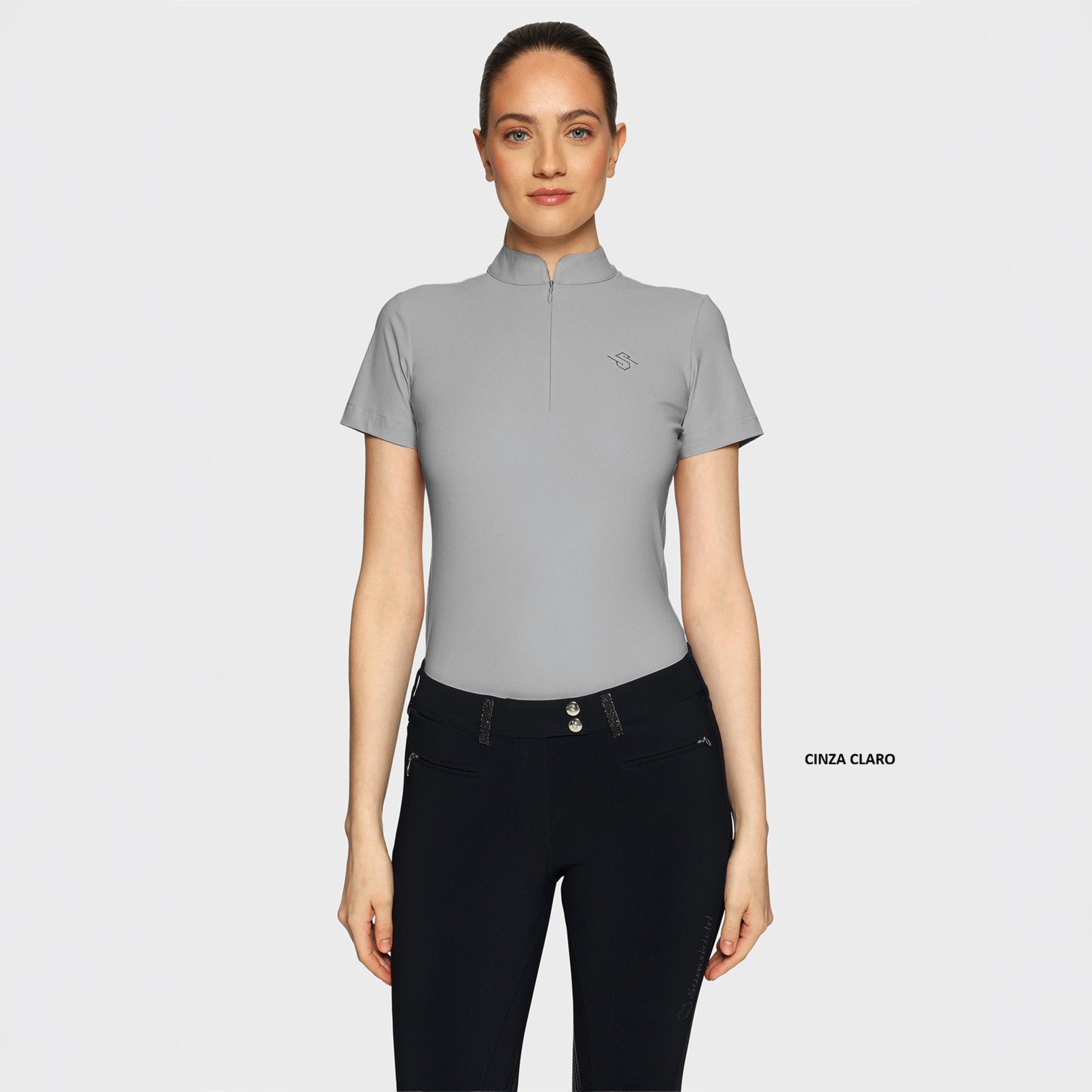 O Bella Crystal Ferna combina elegância e tecnicidade para acompanhar cada cavaleiro com facilidade. O seu corte clássico e a pequena gola refinam a silhueta, enquanto o tecido italiano respirável e elástico garante conforto absoluto e liberdade natural de movimentos. A parte de trás em ponto aberto, realçada pelo padrão Ferna, proporciona leveza e ventilação, ideal para treinos intensivos.